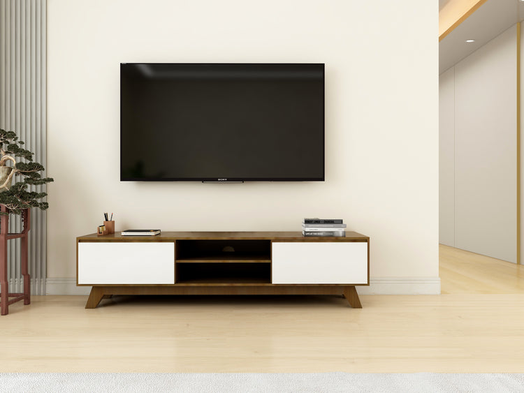 Featuring two contrasting white cabinet doors for concealed storage and open center shelves for media equipment, this unit keeps your space clutter-free and stylish. The warm walnut finish adds richness to the room, while the clean white panels enhance brightness and contrast.