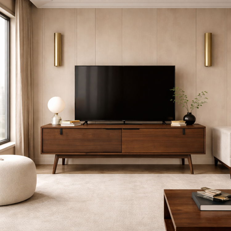 The Walnoir Patina AV Unit is designed for contemporary luxury entertainment spaces. Crafted from solid wood, it offers ample storage while maintaining a sleek, refined aesthetic.