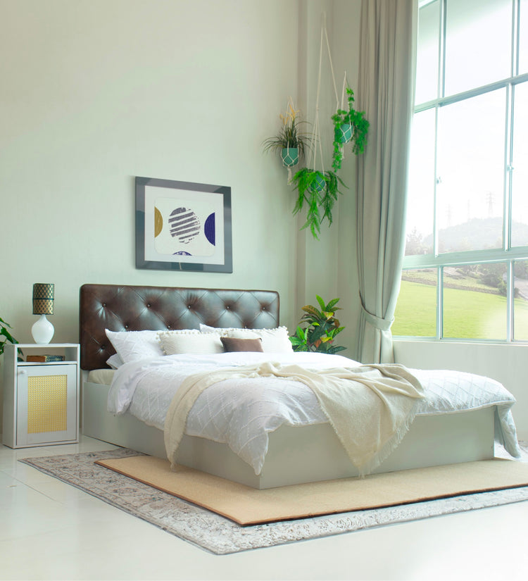 Elevate your bedroom's style and functionality with our premium upholstery headboard, expertly crafted in Malaysia to meet rigorous European standards. This queen-sized bed boasts: